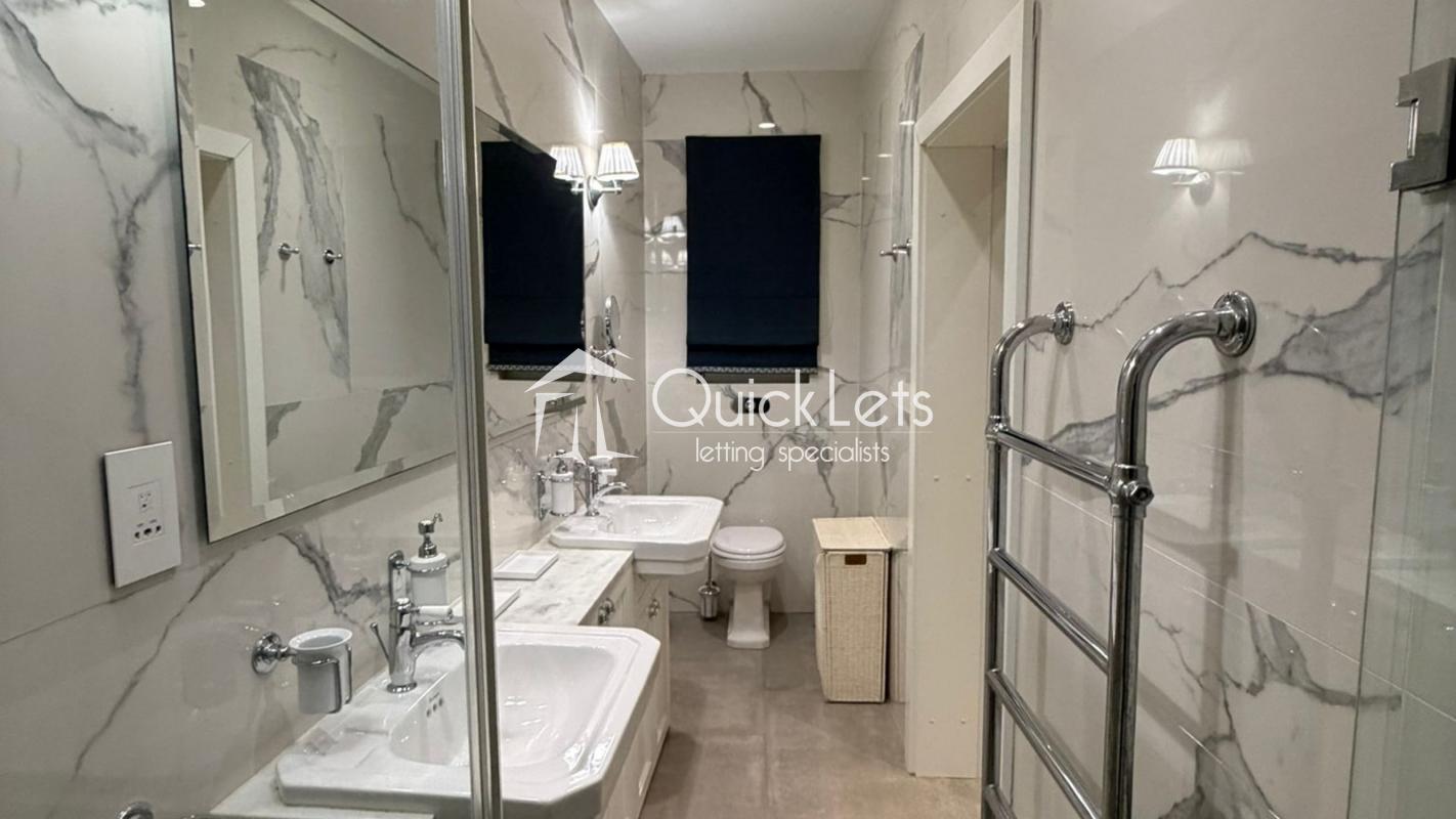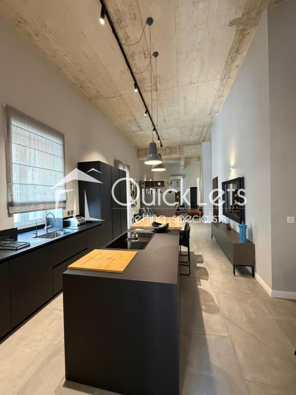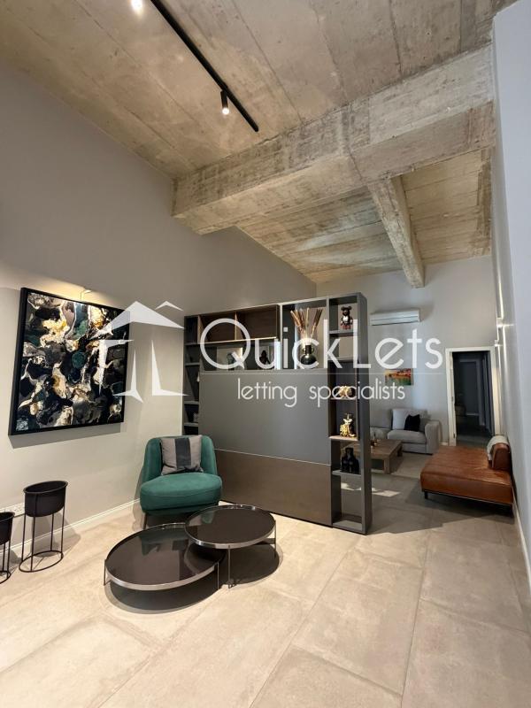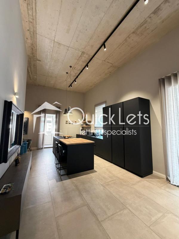The property enjoys high ceilings that enhance the sense of space and natural light throughout. It comprises a bright and modern open-plan kitchen, living, and dining area, fully furnished and equipped with quality appliances and stylish finishes. The apartment offers two spacious double bedrooms and two contemporary bathrooms, including an en-suite, all finished to a high standard.