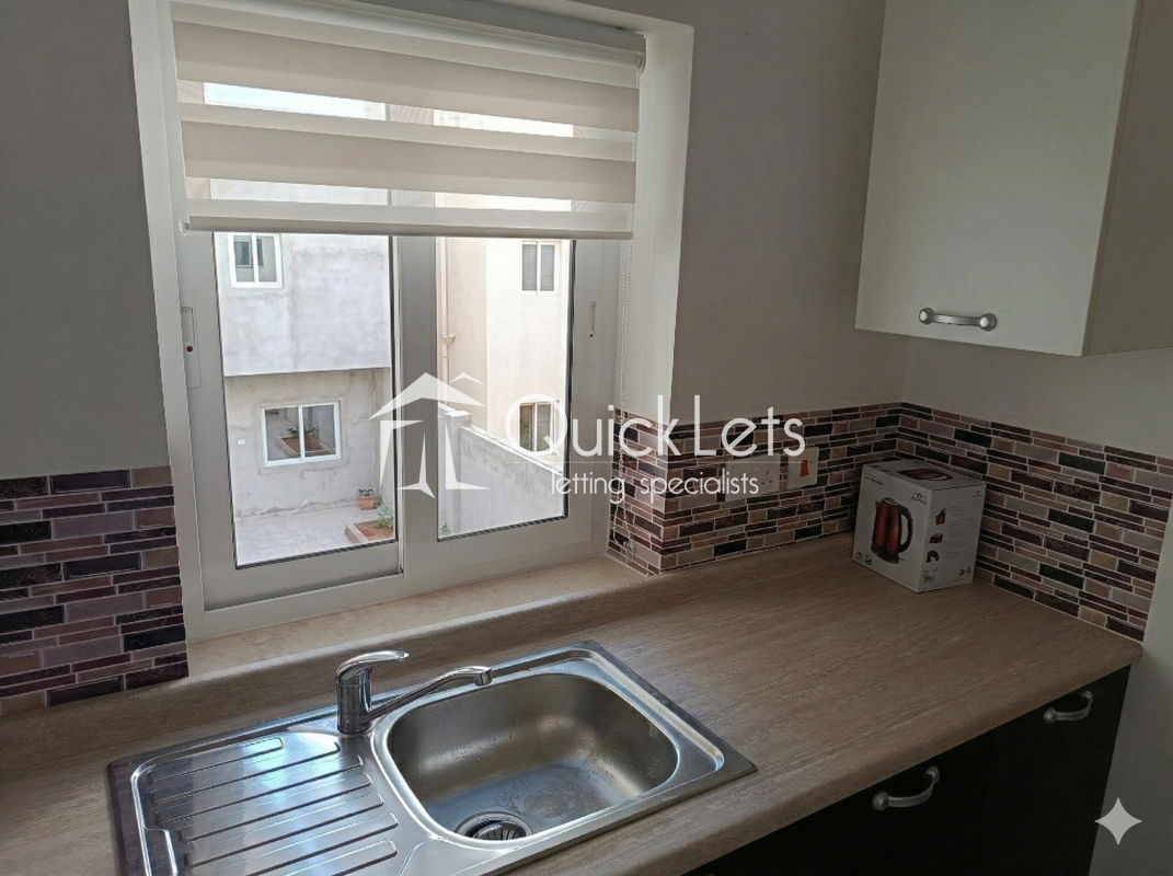 Features elegant wood-textured countertops, a deep stainless steel sink, and stylish mosaic backsplash. Large window provides abundant daylight.