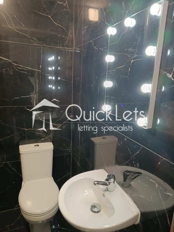 Beautifully finished with premium dark marble-effect tiling and gold veining. Includes a glass shower enclosure and is equipped with a modern Toshiba washing machine.