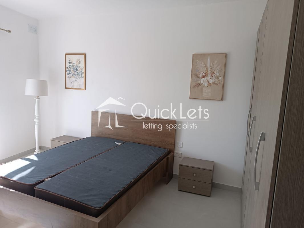 A spacious main bedroom with light grey tiled floors, white walls, and elegant botanical wall art. Furnished with a comfortable wooden bed frame and two modern bedside tables.