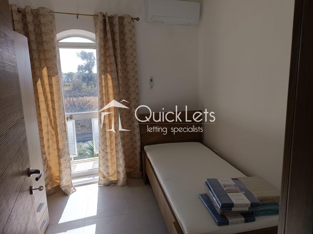 Second Bedroom/Study with Balcony: Offers versatility with a single wooden bed. Features an arched glass door leading to a private balcony, patterned beige curtains, and a wall-mounted AC unit with remote control.
