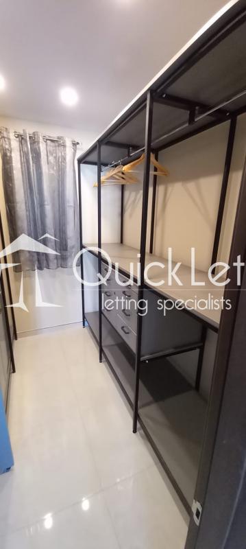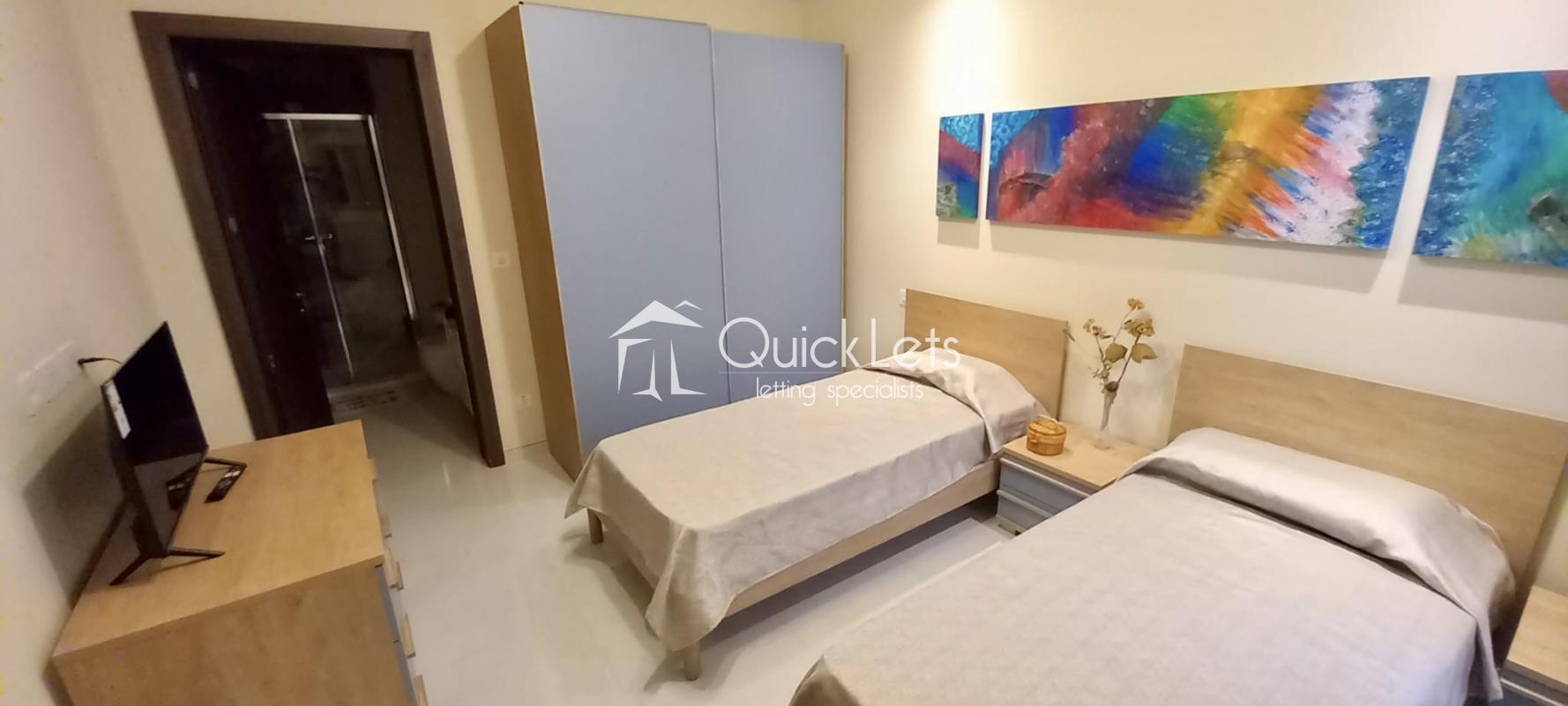 The apartment comprises three bedrooms. One bedroom is furnished with two single beds and includes an ensuite bathroom, as well as a TV and full furnishings. Another bedroom features a double bed with its own ensuite bathroom and a private balcony. The third bedroom is very spacious and includes a balcony and a walk-in wardrobe, offering excellent storage and comfort.