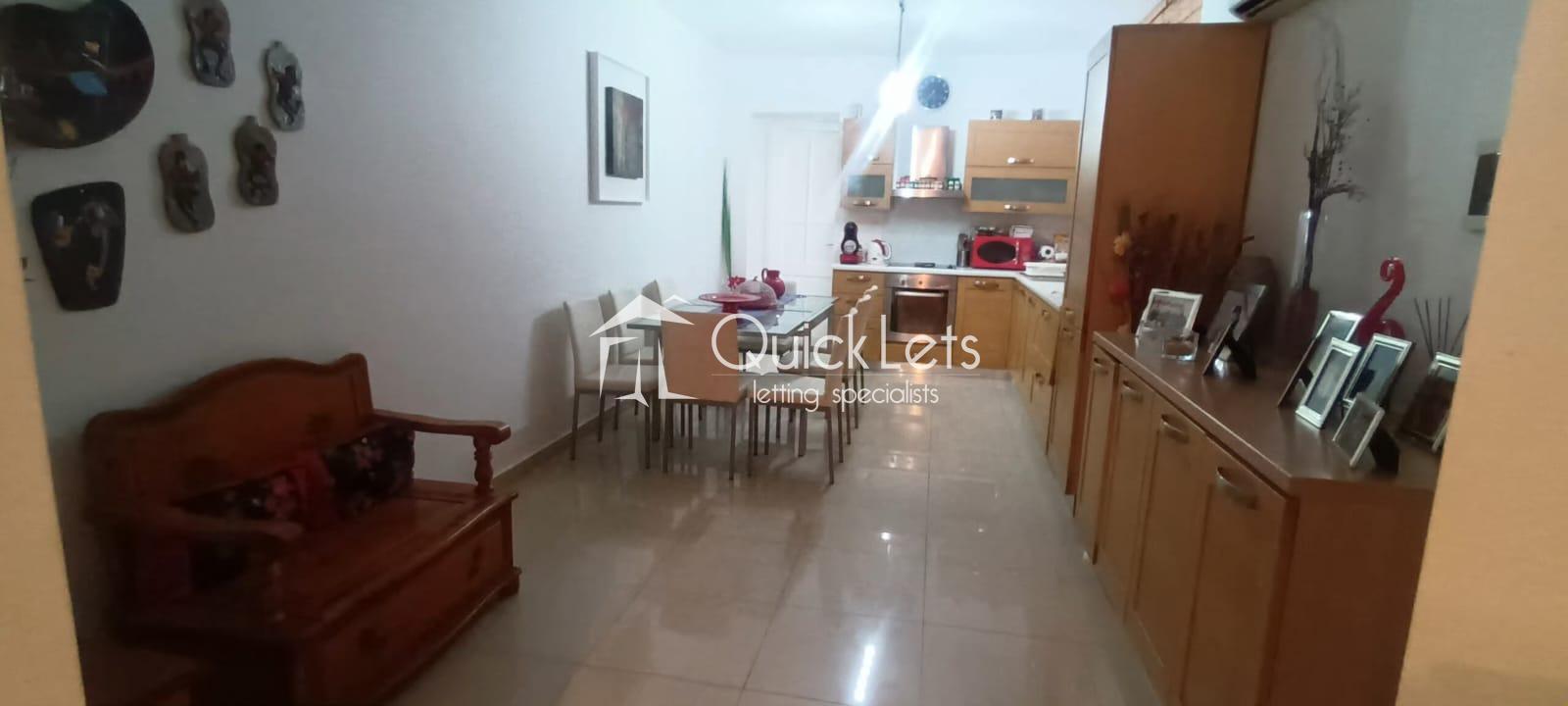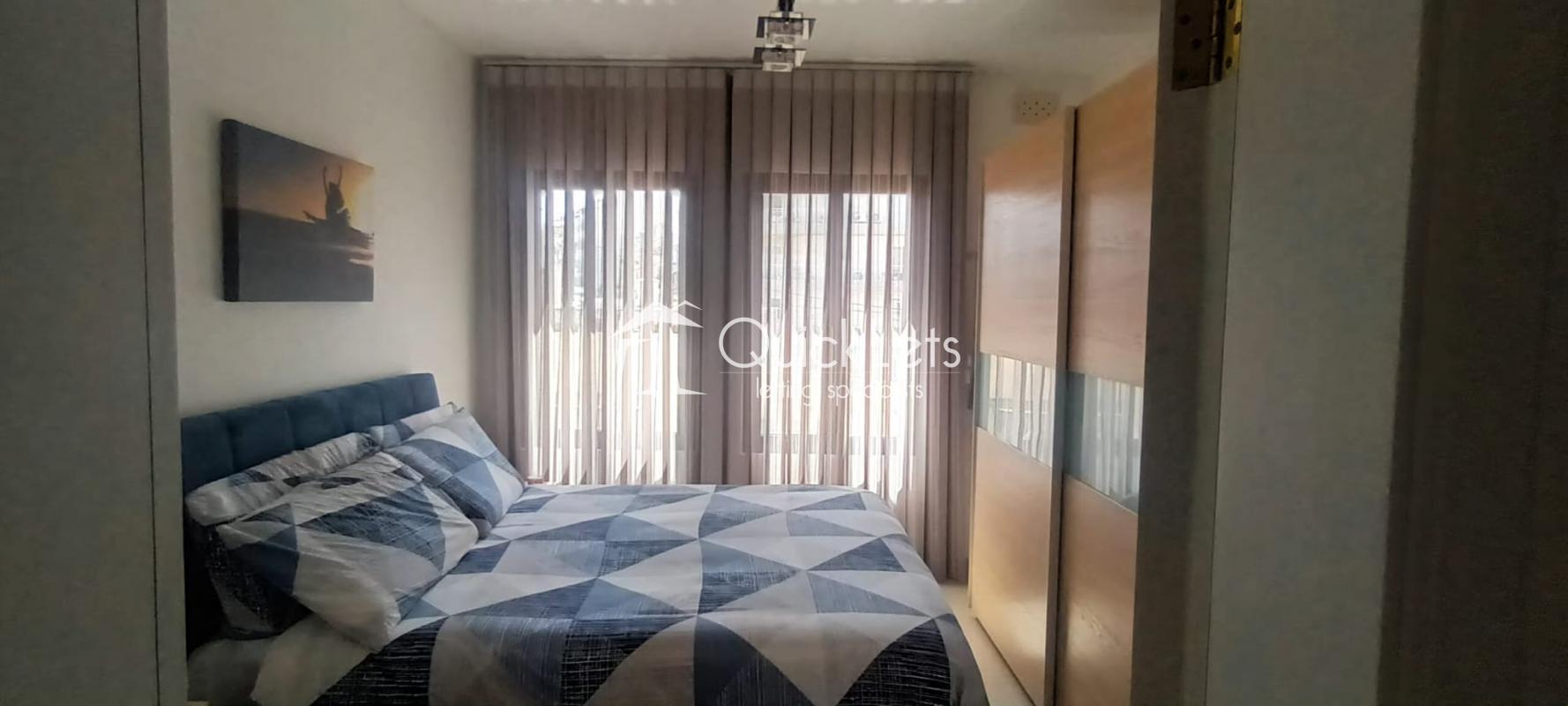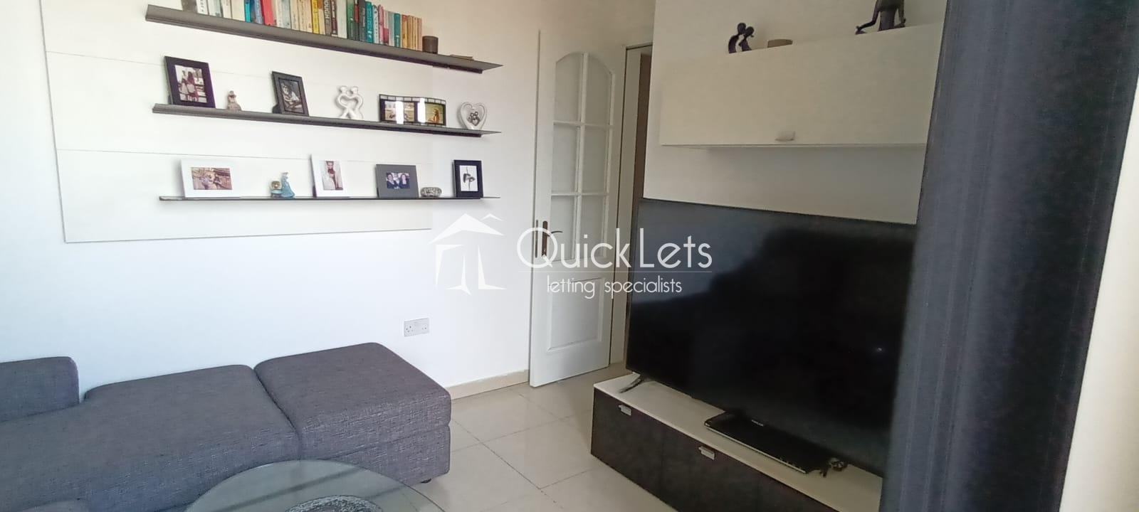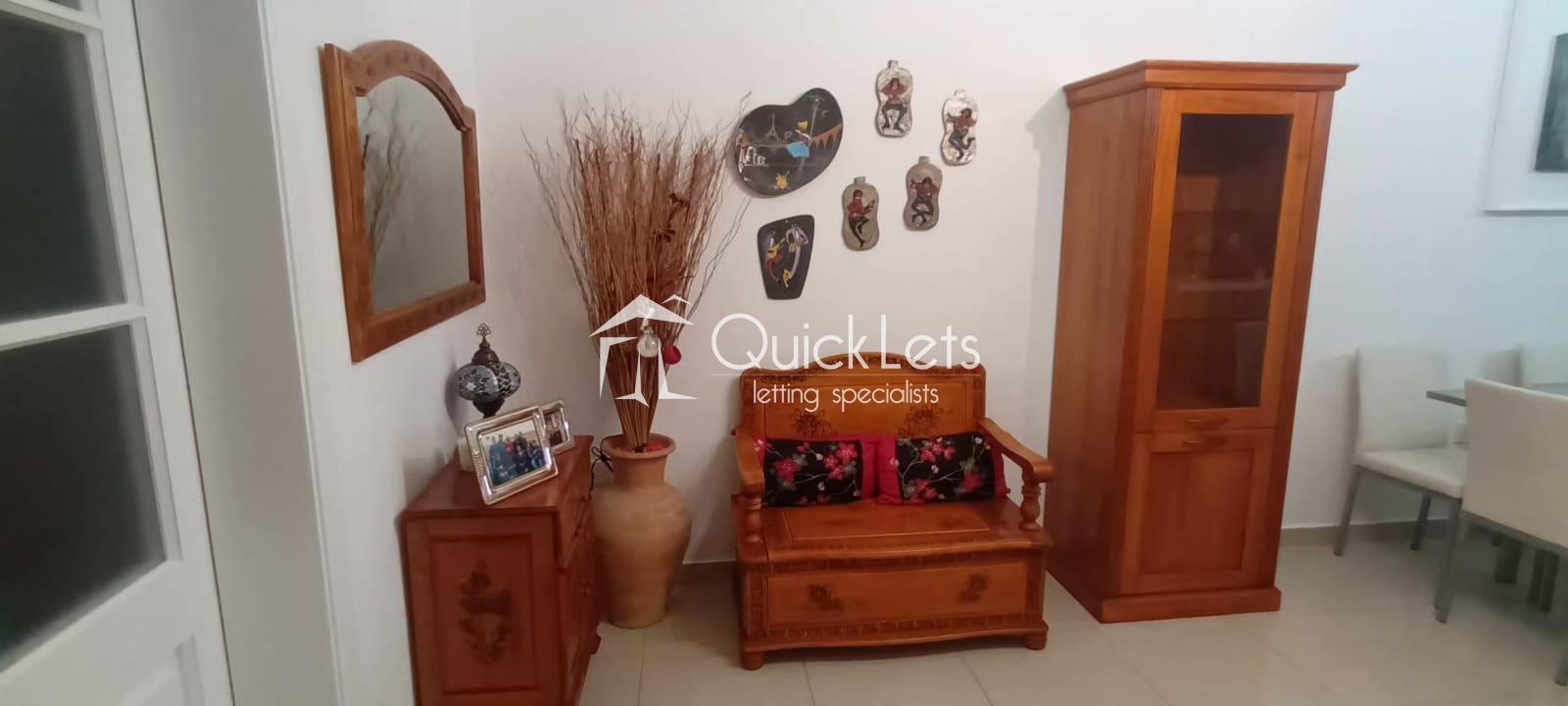 This one-bedroom apartment is located in St. Julian's. It comprises a living room, a sofa, an LCD TV, a small balcony with a small high table, and two chairs. Then there is a kitchen with a dining table, a double bedroom, and a bathroom. This property is also close to all your amenities, and it's fully airconditioned and also wifi is included.